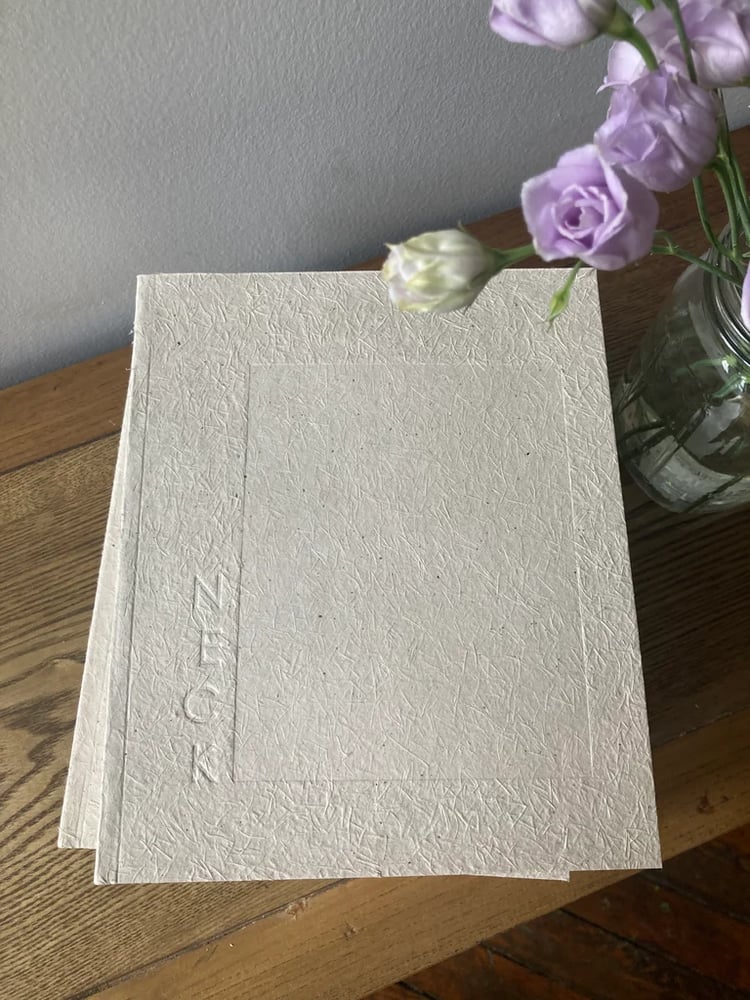 printed on a risograph and bound by hand in cover paper made of abaca and flax and madrone bark and trimmings from the second volume of NECK